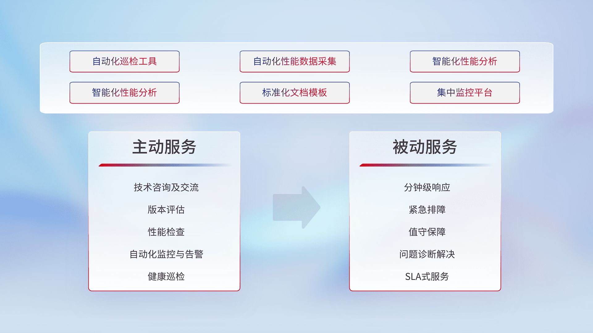 智能化工具和标准化文档,,保障服务质量,,,,提供主动服务(包含技术咨询、、版本评估、、、、性能检查、、自动化监控与告警、、健康巡检)和被动服务包含(分钟级响应、、、紧急排障、、、、值守保障、、、问题诊断解决、、SLA服务)。。。。